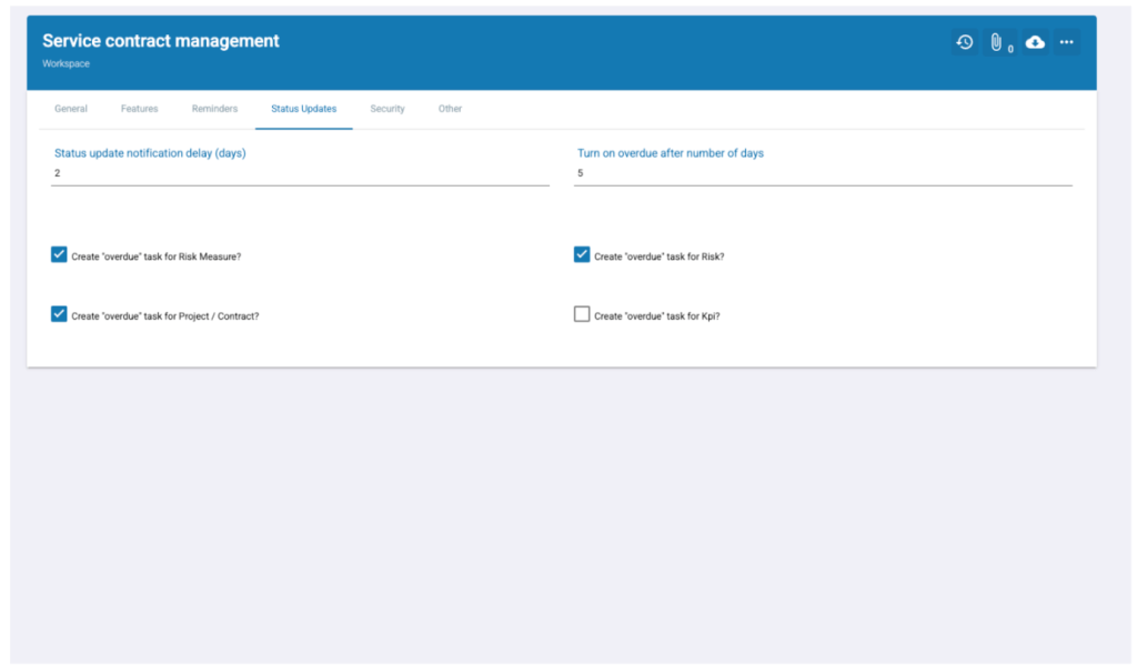 - Status update notificatie vertraging (dagen):Aantal dagen na de geplande updatedatum voordat er een melding naar betrokken gebruikers wordt gestuurd.