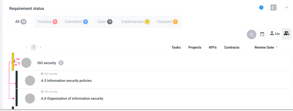 If a requirement has child requirements, they will be displayed under the parent requirement in the “All” tab. In other tabs, the child requirements will appear separately but will indicate the name of the parent requirement.