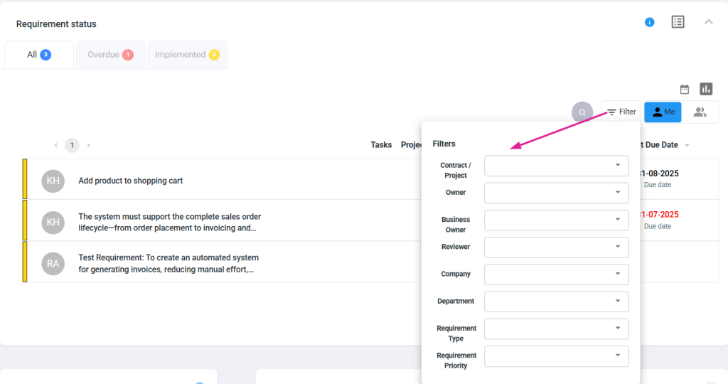 By default, the “me” filter is switched on, displaying only your Requirements. When the ‘All’ filter is selected, all Requirements are shown.