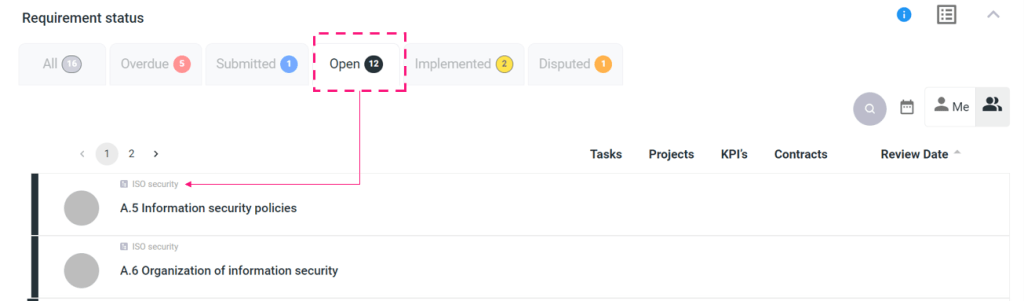 Next to the other filters, you’ll find the search icon (loop icon). Clicking on it will open a search field, allowing you to search for a requirement by name from the list.