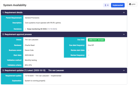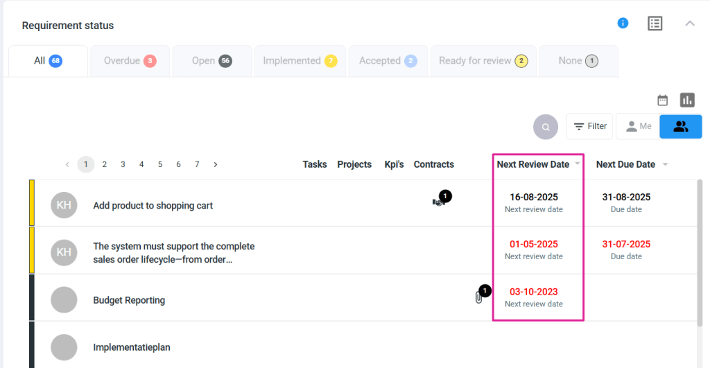If a requirement has a frequency and a review start date, the next review date will be shown.